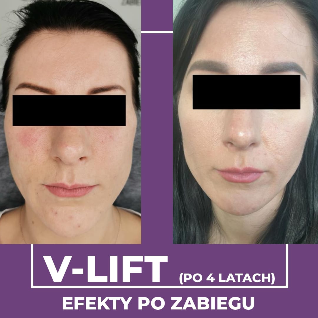Na załączonej grafice mamy efekt zabiegu V-lift po … 4 latach!!! Owal twarzy wciąż jest zarysowany, kwas hialuronowy nie spłynął, nie migrował.